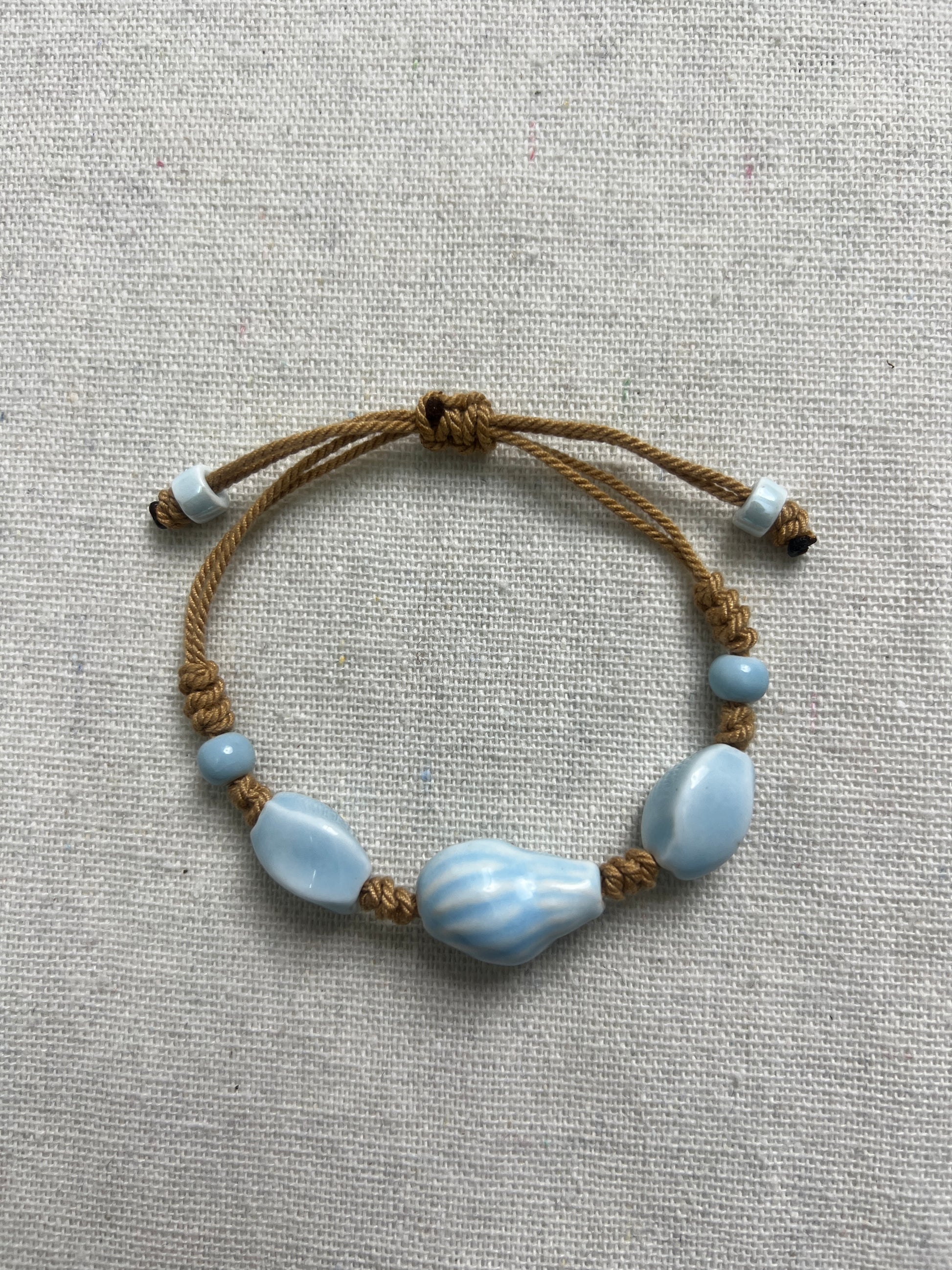Capture the Spirit of the Ocean Bring a piece of the beach with you wherever you go with this charming handmade ceramic bracelet. The centerpiece features a beautifully sculpted blue conch shell bead, flanked by complementary irregular ceramic stones, resembling sea glass pebbles.